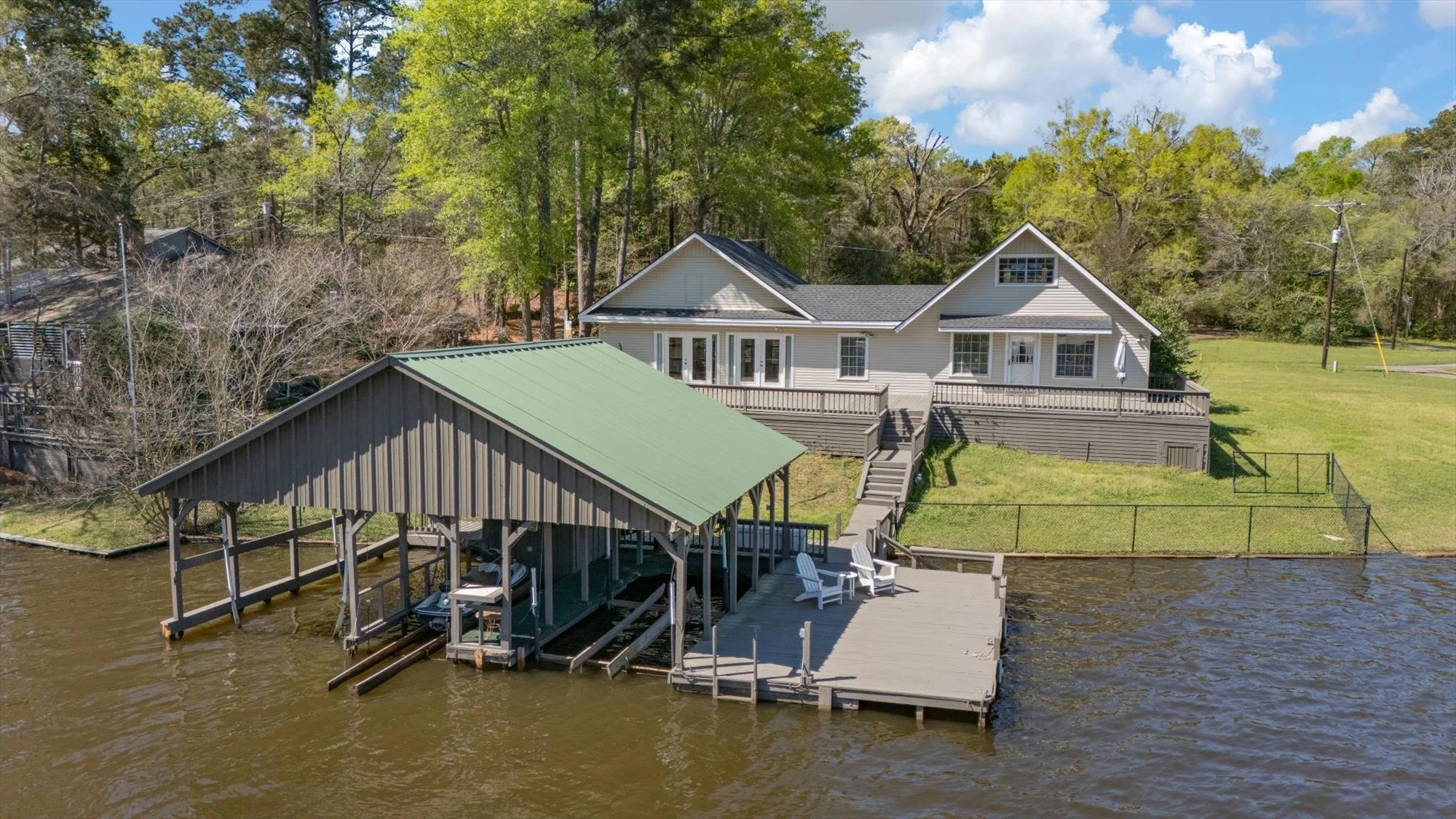 Fully equipped with the largest and most exquisite boathouse on the lake. Features include 3 boat slips, jetski lift, and fully air-conditioned living area.