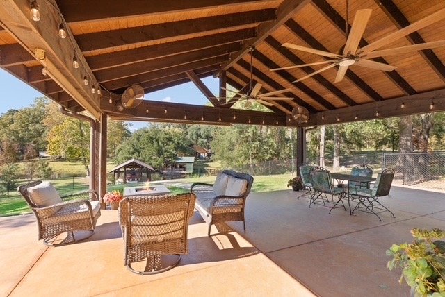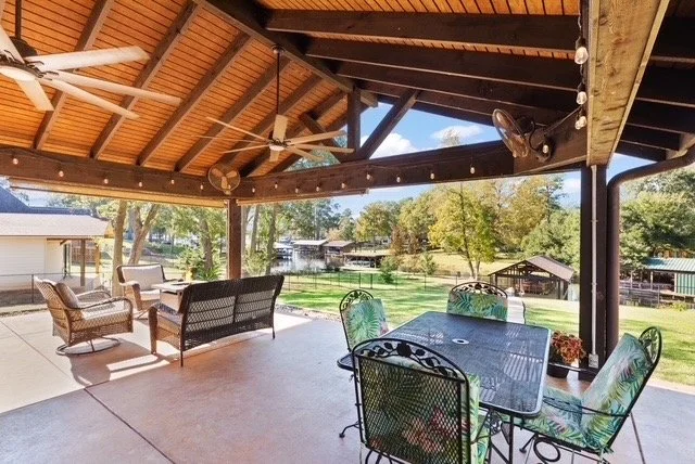 • Large covered lakeside concrete patio with gable roof